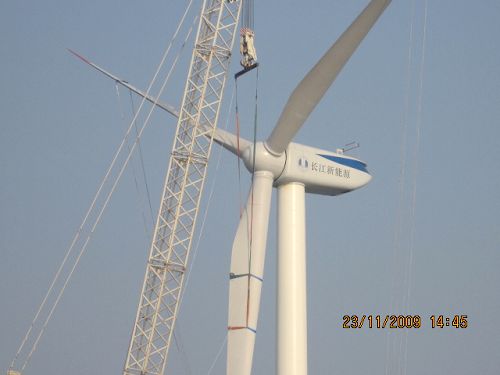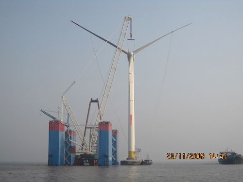 风电公司安装的首台海上试验机,是由三峡总公司投资,中国交通三航局江苏分公司和风电公司联合组织安装的海上风电项目。该项目位于江苏省连云港市响水县境内2.5公里的近海海面上。9月13日,风电公司技术管理人员及作业人员,进入现场开始了前期的各项准备工作,并参与了安装方案的设计、安装工艺的制作等具体工作。该工程采用半潜式驳船上安装工艺,风电公司按照安装方案的要求,设计制作钢支架固定安装在驳船上,并将一千吨履带吊组装固定在钢支架上。按照甲方的要求,风电公司安装人员21日进入海上安装现场,在确保安全的前提下,克服了海上风浪大、施工现场狭小及一些意想不到的困难,终于在23日圆满成功地完成了安装任务。海上风电安装的成功标志着风电公司开始进入海上风电安装新领域,并为今后海上风机安装积累宝贵经验。