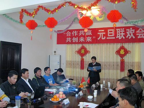 2009年12月31日下午,湛江钢铁工程场地平整项目经理部四楼会议室张灯结彩,火红的灯笼高高挂起,在喜庆的中国结的映衬下,印有“‘合作共赢,共创未来’元旦联欢会”的横幅显得分外耀眼。