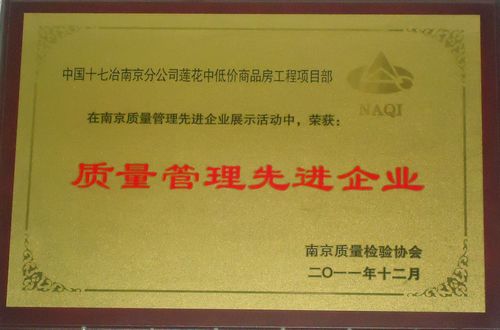 日前,南京河西莲花中低价商品房工程项目部在南京市质量检验协会举办的南京市质量管理先进企业展示活动中,成绩优异,被评为“质量管理先进企业”。
