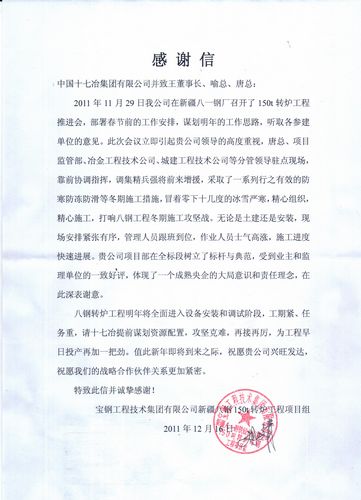 1216,宝钢工程技术集团公司向中国十七冶集团发来感谢信,感谢我公司在新疆八一钢铁150T转炉施工中,为完成1129150T转炉工程专题会中部署的各项工作所付出的努力。