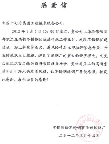 314,宝钢集团不锈钢事业部向十七冶工程技术服务公司发来感谢信,对该公司宝钢检修项目部员工乐于助人,勇救不锈钢扩建区域3#上料皮带机火情,争分夺秒抢修设备表示衷心感谢。