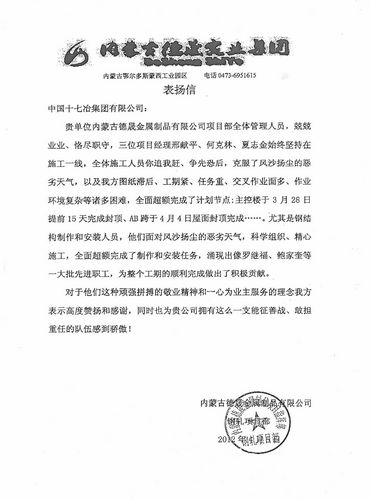 45,内蒙古德晟实业集团向中国十七冶集团发来表扬信,高度赞扬我公司在内蒙古德晟金属制品公司项目建设中的突出表现和做出的贡献。