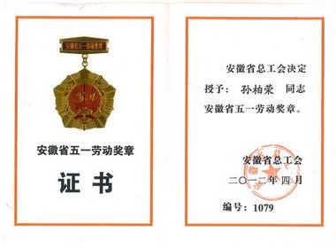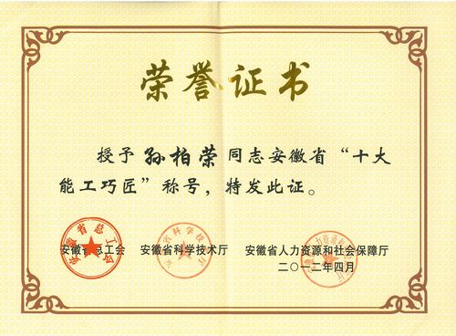 孙柏荣同志获安徽省“十大能工巧匠”称号