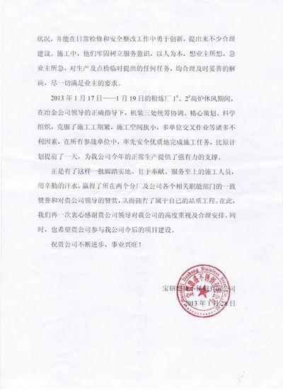 日前,宝钢德盛不锈钢有限公司向中国十七冶集团致感谢信,对我公司安全、优质地完成了宝钢德盛不锈钢有限公司烧结厂、粗炼厂机电检修工程检修计划,为该公司生产提供了安全环保的作业环境,为设备正常高效运转提供了有力保障表示衷心感谢。