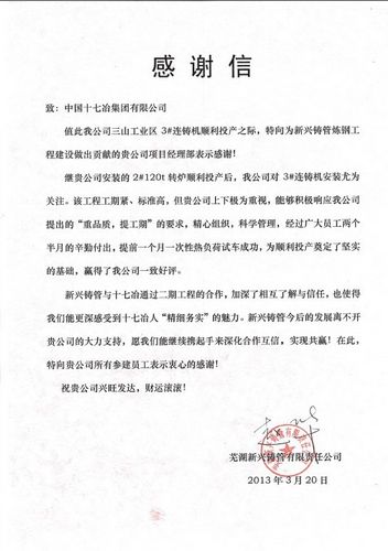329,正值中国十七冶集团冶金工程技术公司承建的芜湖新兴铸管三山工业区3#连铸机顺利投产之际,芜湖新兴铸管有限责任公司向我公司发来感谢信,对我公司为新兴铸管炼钢工程建设做出的贡献表示感谢。