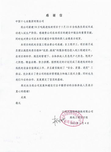64日,江阴兴澄特种钢铁有限公司向中国十七冶集团致感谢信,感谢冶金工程技术公司在该公司50万吨高速线材项目的建设中做出的突出贡献,同时也对我公司在该项目中取得的业绩表示祝贺。