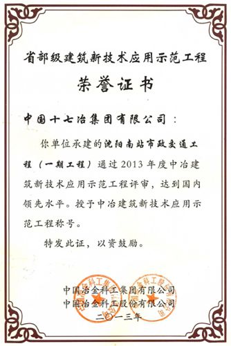 日前,由中国十七冶集团城建工程技术公司承建的沈阳南站市政交通工程(一期工程)荣获中冶集团暨中国中冶授予的2013年度“省部级建筑新技术应用示范工程”称号。