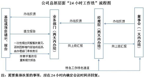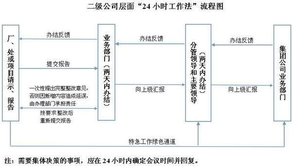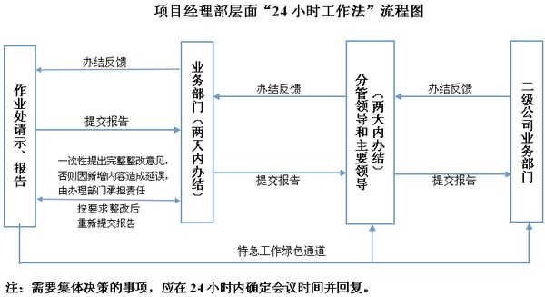 所谓“24小时工作法”,即总部机关五个层级各用不超过24小时的时间不停顿地为基层或项目办理需要解决的问题。具体要求是:总部机关按照业务归口,部门受理人要将基层或项目需要解决的事项在24小时内办结;如资料、手续不完整的,应一次性提出完整性整改要求和建议,在24小时内反馈;如按职责权限在24小时内无法办结的,及时向部门主要负责人报告,在48小时内办结;如按职责权限在48小时内无法办结的,应及时向公司分管领导报告,在72小时内办结;如按职责权限在72小时内无法办结的,应及时向公司总经理报告,在96小时内办结;如按职责权限在96小时内仍无法办结的,应及时向公司董事长报告,在120小时内办结。公司用“24小时工作法”对“一天也不耽误,一天也不懈怠”工作作风进行诠释、细化,并将此上升到公司制度层面予以固化,作出刚性要求。公司以此标准来约束管理人员的行为,对基层或项目反映的事项不能久拖不决或不管不问不报告,不以任何理由推诿不处理。如果出现这样的问题,公司将进行追责。二级公司、项目经理部也要对照此项工作法执行。
