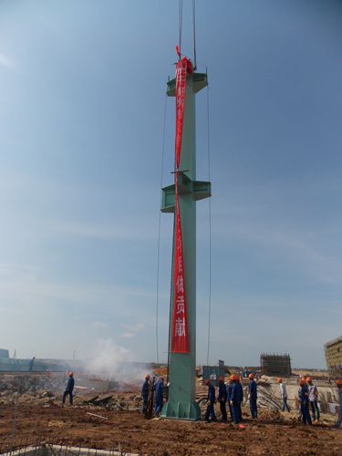 518上午928分,伴随着宝钢湛江钢铁副总指挥刘代德的一声“起吊”,主厂房钢结构吊装主吊车4000t·m塔吊开动,转炉跨首根钢柱缓缓就位,中国十七冶集团承建的宝钢湛江炼钢工程主厂房钢结构安装工程拉开了帷幕。