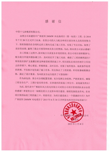 近日,中广核射阳风力发电有限公司项目部致信中国十七冶集团,衷心感谢十七冶风力与太阳能发电工程技术公司在射阳风电项目一标段工程施工中,保质保量完成施工任务,如期实现了节点目标,在参建的四家施工单位中,表现最为突出。