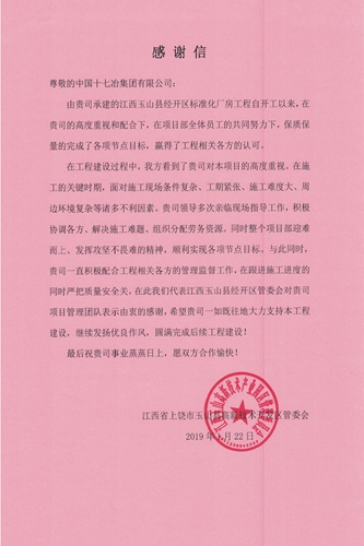 1月22日,江西省上饶市玉山县高新技术开发区管委会向中国十七冶集团发来表扬信表扬管廊工程技术分公司江西玉山县经开区标准化厂房工程项目部在工程建设中做出的突出贡献