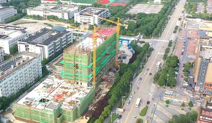 安徽中医药高专后勤综合楼工程占地面积6684.96平方米,建筑面积34955.34平方米,地上建筑面积30313.2平方米,地下建筑面积4642.10平方米,目前正是大干阶段。本项目施工场地狭小,地处闹市区交通不便,有三面仅有6米宽的消防通道,另外一侧紧邻学校大门,施工组织非常困难。在施工工艺中钢柱对接、与钢筋混凝土焊接较为复杂,容纳800人的汇报大厅为大空间大跨度结构,其结构模板支撑搭设为施工的重难点。施工中,项目部持续优化施工方案和工序,稳步推进工程进展。年初,项目部积极克服疫情影响,全力推进工程全面复工,分班组分时段作业,努力把失去的时间抢回来。目前,工程已比计划工期提前了半个月,现在正全力冲刺主楼封顶,并同步推进二次结构施工,并开始组织进行芜湖市安全文明标准化工地验收,确保工程于2020年底竣工。