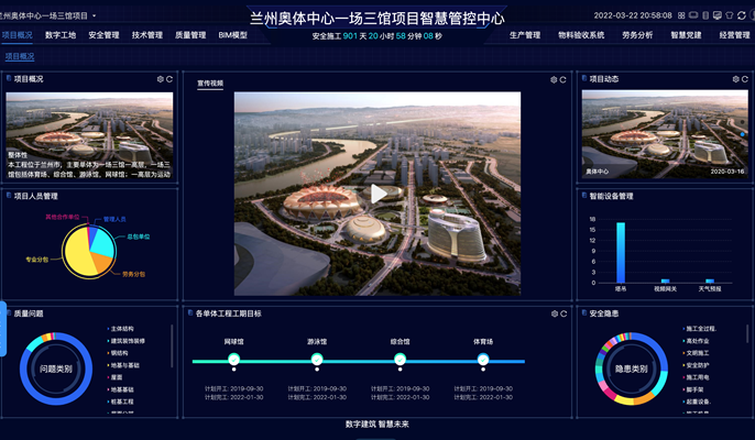 聚焦智慧建造。针对工期紧、体量大、多专业交叉作业、造型复杂等困难,项目团队自开工伊始就确立了“以馆为点、以场为线,点线结合、均衡推进”的建设思路。项目技术团队率先在兰奥采用以国家5G通信建设为基础,充分利用智能传感器、智能视频身份识别、大数据、云计算等新技术,着力打造智能化建筑新标杆。通过智能化管控技术支撑各业务间的互联互通、数据共享,搭建起以进度为主线、以成本为核心、以项目为主体的多方协同、多级联动、管理预控、整合高效管控平台,全周期护航工程质量、安全、进度、成本等建设目标顺利实现。