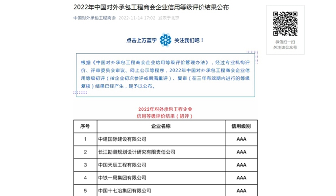11月14日,中国对外承包工程商会发布2022年对外承包工程企业信用等级评价结果。经过专业机构评价、评审委员会审议、网上公示等程序,中国十七冶集团被评为2022年对外承包工程企业最高信用等级AAA级企业,有效期3年。