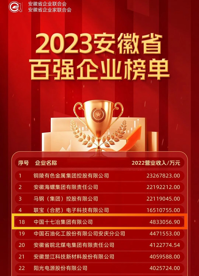 中国十七冶荣登2023年安徽省百强企业第18位