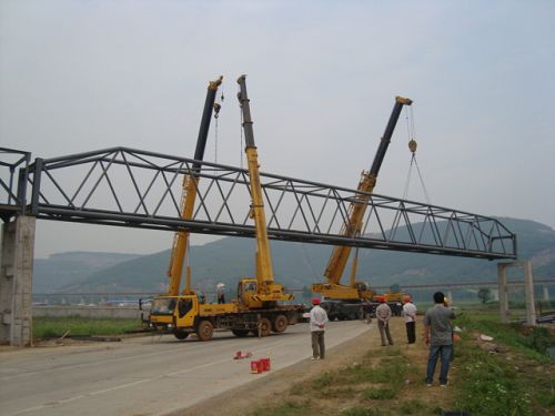 此次跨钢桁架跨度55.5m,为钢管构件,重量约53t,两端为砼支架,跨越沿新公路,吊装难度较大。此段廊道跨越已经通车的公路且车流量较大,在吊装前由交通管理部门,在道路两端设置告示牌,并由交警部门进行交通管制,道路全封闭,为确保成功吊装,该项目部优化施工方案,采用一台70t、两台25t抬吊,相互配合,确保了该钢桁架一次就位成功。