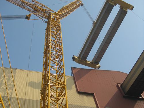 7日上午,项目部采用600T履带吊将280T行车的第一根主梁缓缓吊起至50高空,再徐徐下落,经24m×12m房顶洞口落入吊车梁上。经过三天努力,至9日下午,行车2根主梁、2根副梁、2根端梁、主小车、副小车的吊装全部顺利完成。