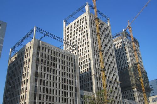 蚌埠金融中心A、B主楼楼顶钢构吊装完成