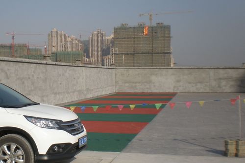 这18个车位由红、绿两种颜色透水混凝土组成,整洁规范,给人以视角美感。