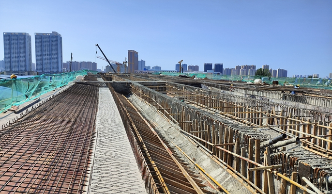 本次浇筑的U11联为预应力砼等高连续梁,全长90.0米,宽25.3米,上部结构采用单箱多室断面,高2.0米,支座横向中心距为6.3米,下部结构采用双直柱花瓶墩加承台的形式。为保证混凝土浇筑的顺利进行,项目部高度重视,努力克服高温天气影响,积极筹划,真抓实干,制定科学有效的施工计划,不断提高施工效率;采用科学的管理方式,对施工目标任务进行分解,合理调配人员及机械设备,规范工艺流程,技术人员在进行详细技术交底后,全程现场指导监督,严格保障施工质量;在摊铺施工中,项目部为一线施工人员发放防暑降温物品,安全员全程监督排查安全隐患,努力营造安全的施工环境。此次U11联的顺利浇筑,为抢抓工程节点和后续的地面辅道施工创造了有利条件。