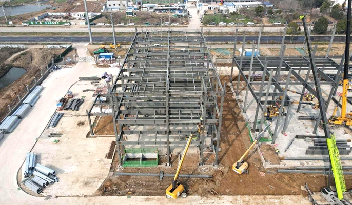 本项目位于马鞍山市经开区,总建筑面积约4.1万平方米,厂区钢结构建筑物包括原材料及成品仓库、试制生产车间、性能测试车间、预锂车间、危废及危化品库、固废库及管廊等。此次封顶的原材料及成品仓库一、二层为钢结构平台框架,上铺钢筋桁架楼承板后浇筑成混凝土平台,三层为门式钢架,最大跨度10.7米,长度为41.5米,宽度为21.4米。钢柱为箱型柱,箱型柱最长柱长为21.63米,箱型柱为整节柱,钢柱重量约为7.6171吨。