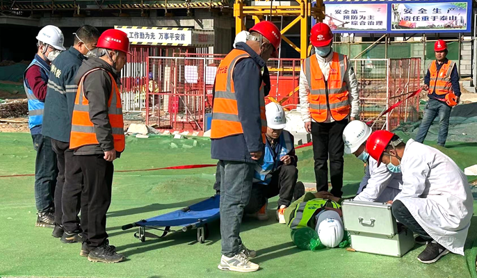 为确保演练活动有序展开,项目部提前策划、精心准备,组织全体人员学习高空坠落事故应急救援知识,准备充足的救援物资并明确了人员分工。此次演练模拟高空坠落场景,随着现场警报器长笛示警,应急救援演练拉开序幕。项目部安全员在接到外架班组长的事故报告后,立即启动应急预案,组织各小组进行救援。应急救援队下设安全警戒组、医疗救护组、隔离疏散组、通讯联络组四个小组,各组接到命令后迅速赶往事故现场,警戒组拉起安全警戒线,封锁事故现场,维持现场秩序;医疗救护组对伤员进行了简单的救治和护理;隔离疏散组对现场与救援无关人员进行疏散,防止事态扩大;通讯联络组联络120急救车辆进行到场医疗救治。演练过程中,各小组各司其职、配合默契,救援过程井然有序。