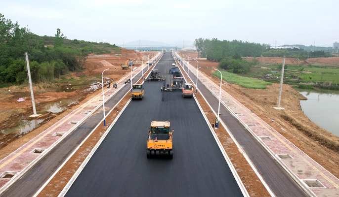 4月29日,中国十七冶路桥分公司承建的含山经开区承接长三角产业转移基地建设一期项目刘武大道二期开始沥青下面层摊铺作业。