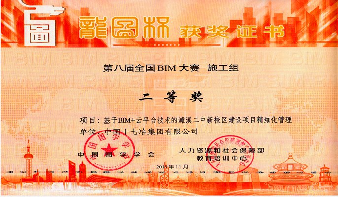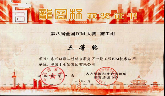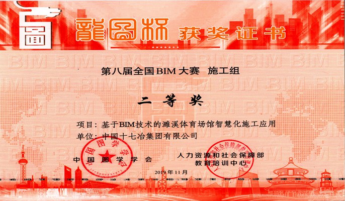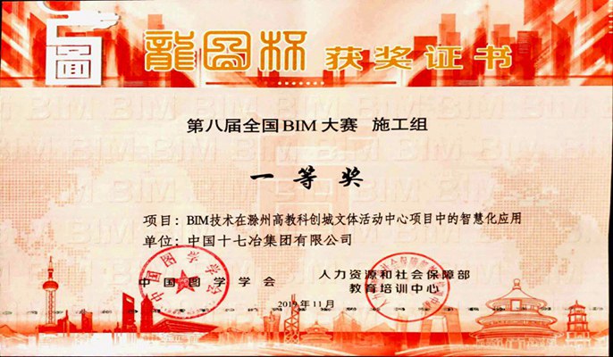 11月21日,在2019年第八届“龙图杯”全国BIM颁奖会上,中国十七冶申报的“BIM技术在滁州高教科创城文体活动中心项目中的智慧化应用”、“基于BIM+云平台技术的濉溪二中新校区建设项目精细化管理”、“基于BIM技术的濉溪体育场馆智慧化施工应用”“东兴口岸二桥综合服务区一期工程BIM技术应用”两项作品经过初评、复评、终评答辩在1844项作品中脱颖而出,分别荣获施工组一、二、三等奖。