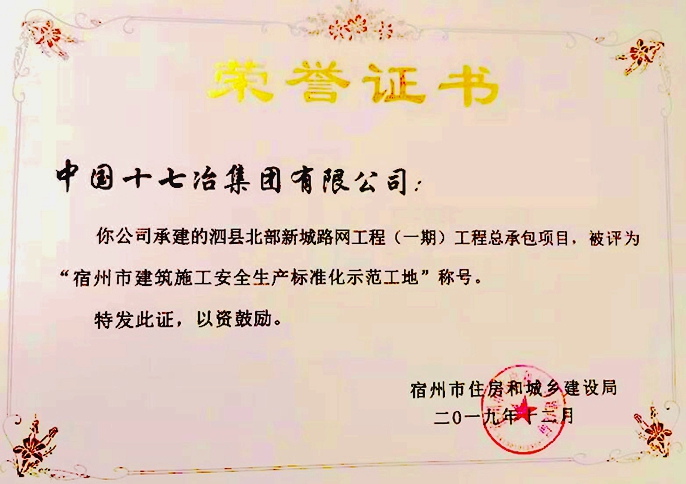 12月20日,从宿州市住房和城乡建设局获悉,中国十七冶集团路桥工程技术分公司泗县北部新城路网工程(一期)项目荣获“宿州市建筑施工安全生产标准化示范工地”称号。