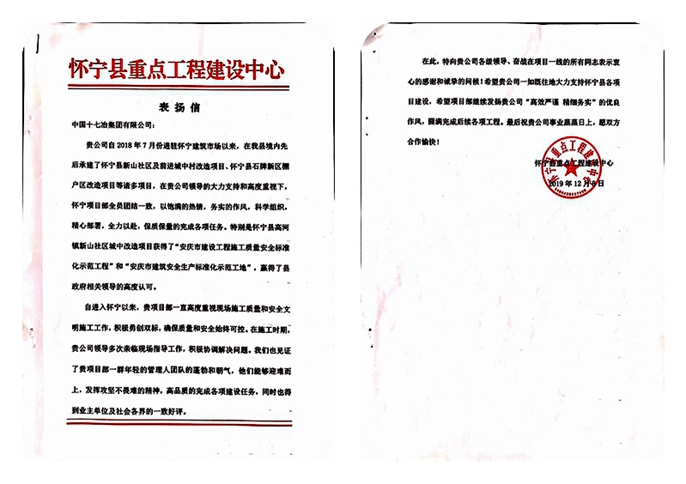 感谢信中指出,十七冶自进入怀宁以来先后承建了怀宁县新山社区及前进城中村改造项目、怀宁县石牌新区棚户区改造项目等诸多项目,在公司领导的大力支持和高度重视下,怀宁项目部全员团结一致,以饱满的热情,务实的作风,科学组织,精心部署,全力以赴,保质保量地完成各项任务。特别是怀宁县高河镇新山社区城中村改造项目获得了“安庆市建设工程施工质量安全标准化示范工程”和“安庆市建筑安全生产标准化示范工地”,赢得了县政府相关领导的高度认可。