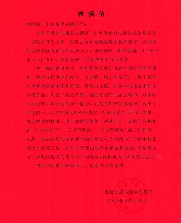 表扬信指出,在工程建设工程中,公司及项目部面对各村协调难度大、工期紧、施工涉及面广、地下管网环境复杂等诸多不利因素,精心组织,迎难而上,克服各种难题,以实际行动证明公司的实干能力,为支持雄安新区建设,迈出关键一步,彰显了企业作风,得到了雄县住房与城乡建设局的充分肯定。同时希望十七冶一如既往地支持项目工程建设,再接再厉,取得更大进步。