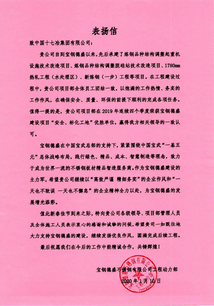 110日上午,中国十七冶集团收到了来自宝钢德盛不锈钢有限公司发来的表扬信。