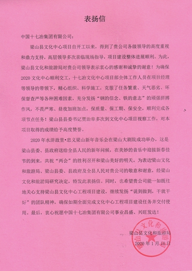 118日,梁山县文化和旅游局向中国十七冶集团发来表扬信,对十七冶山东分公司顺利完成梁山县文化中心工程各施工节点,及公司领导对该项目的高度重视、项目部全体人员的辛勤付出表示感谢。
