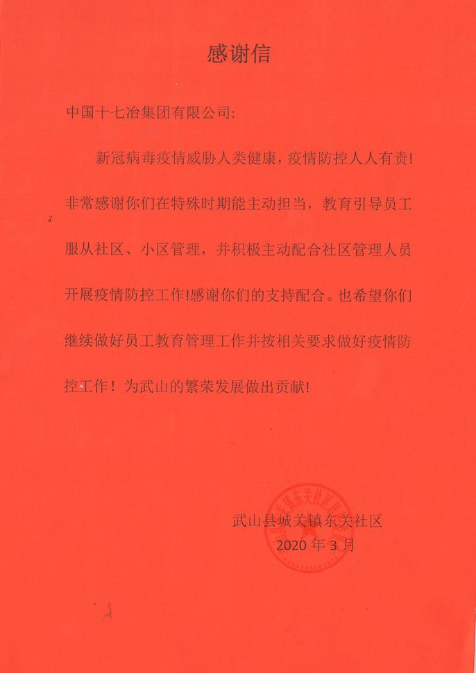 35日,天水市武山县城关镇东关社区向中国十七冶集团发来感谢信,对十七冶集团公路工程技术分公司承建的天水G310项目在2020年新冠肺炎疫情期间积极配合社区开展疫情防控工作表示感谢。