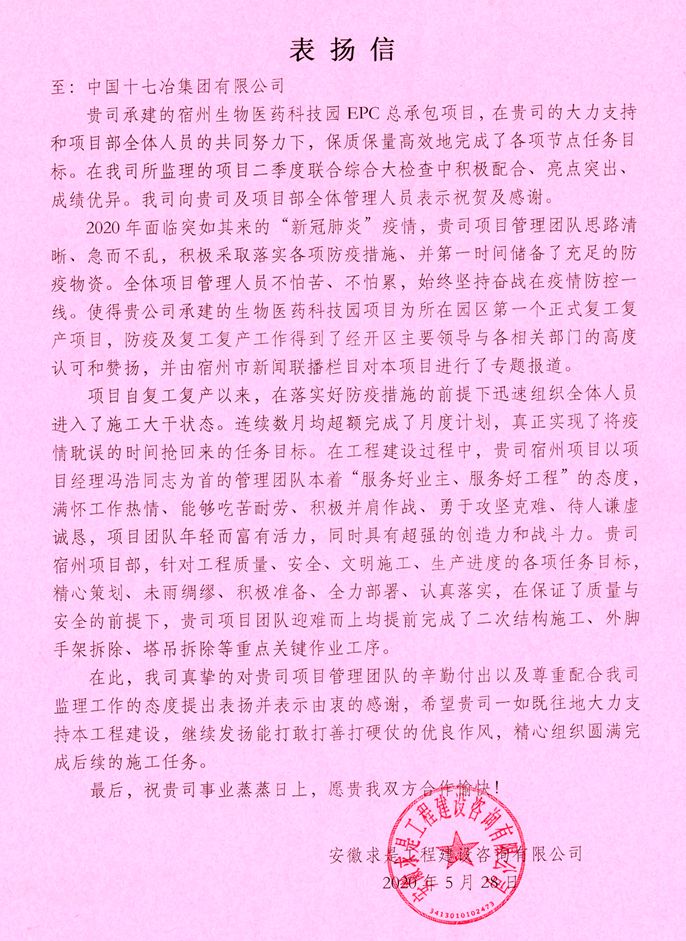5月29日,安徽求是工程建设咨询有限公司向中国十七冶集团致表扬信,对中国十七冶集团在承建宿州生物医药科技园项目进程中“高效严谨、精细务实”的企业作风给予高度赞扬。