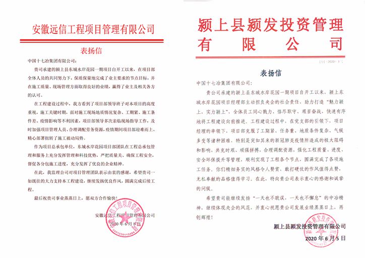 6月8日和10日,安徽远信工程项目管理有限公司和颍上县颍发投资管理有限公司分别向中国十七冶集团致表扬信,对中国十七冶集团在承建颍上县东城水岸花园一期项目中精细务实的风格与敢打硬仗的作风给予了高度赞扬。