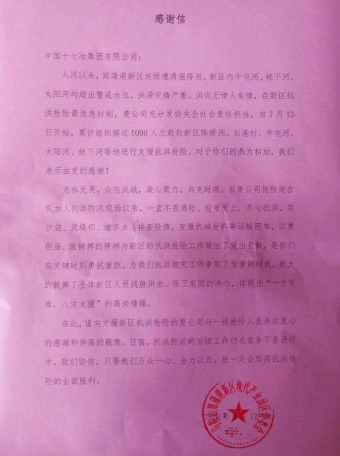 感谢信中指出,入汛以来,郑蒲港新区连续遭遇降雨,新区内牛屯河、姥下河、太阳河均超出警戒水位,洪涝灾情严重,在新区抗洪抢险最危急时刻,十七冶充分发扬央企社会责任担当,从7月13日起,累计组织超过1000人次赴新区陈桥洲、后港村、牛屯河、太阳河、姥下河等地进行支援抗洪抢险,对十七冶的鼎力相助,表示由衷的感谢。