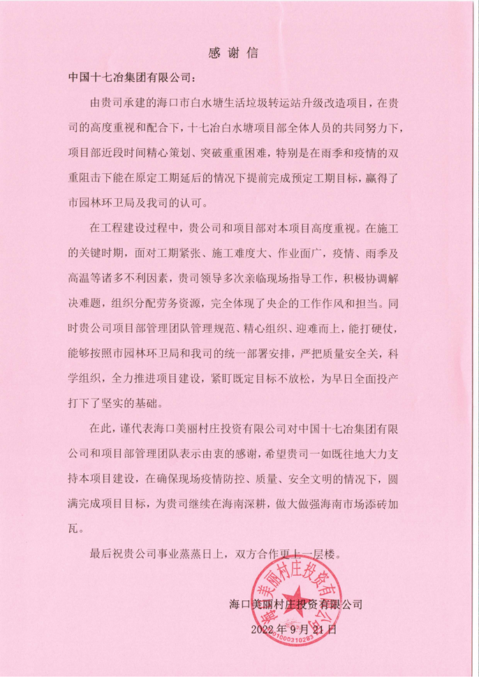 海口美丽村庄投资有限公司向十七冶致感谢信