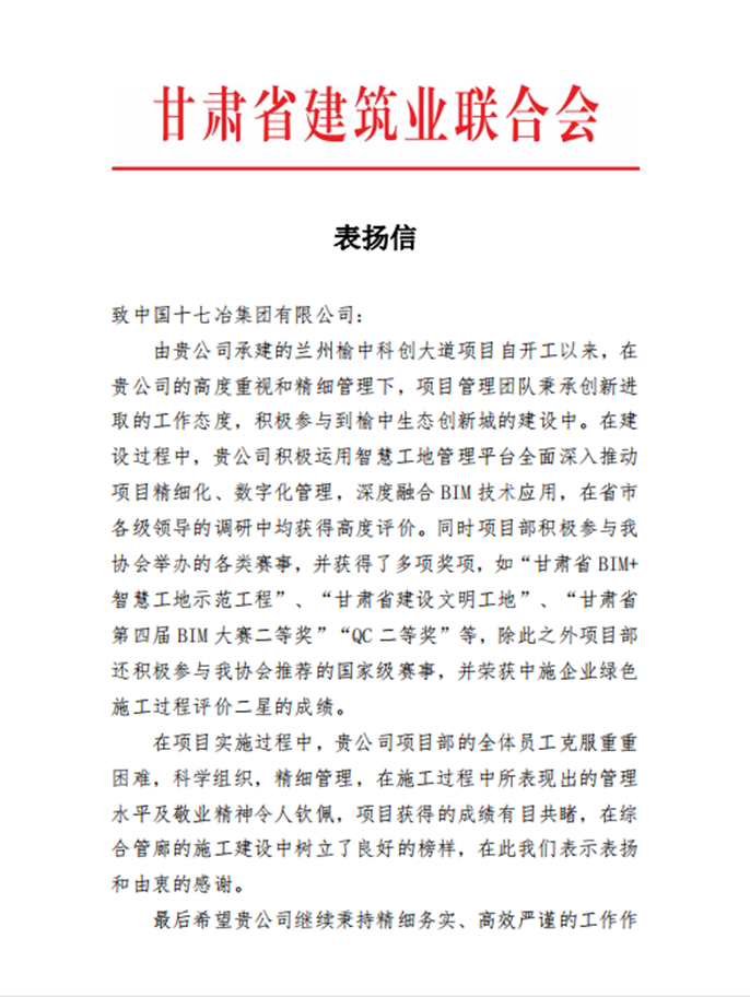 甘肃省建筑业联合会向十七冶致表扬信