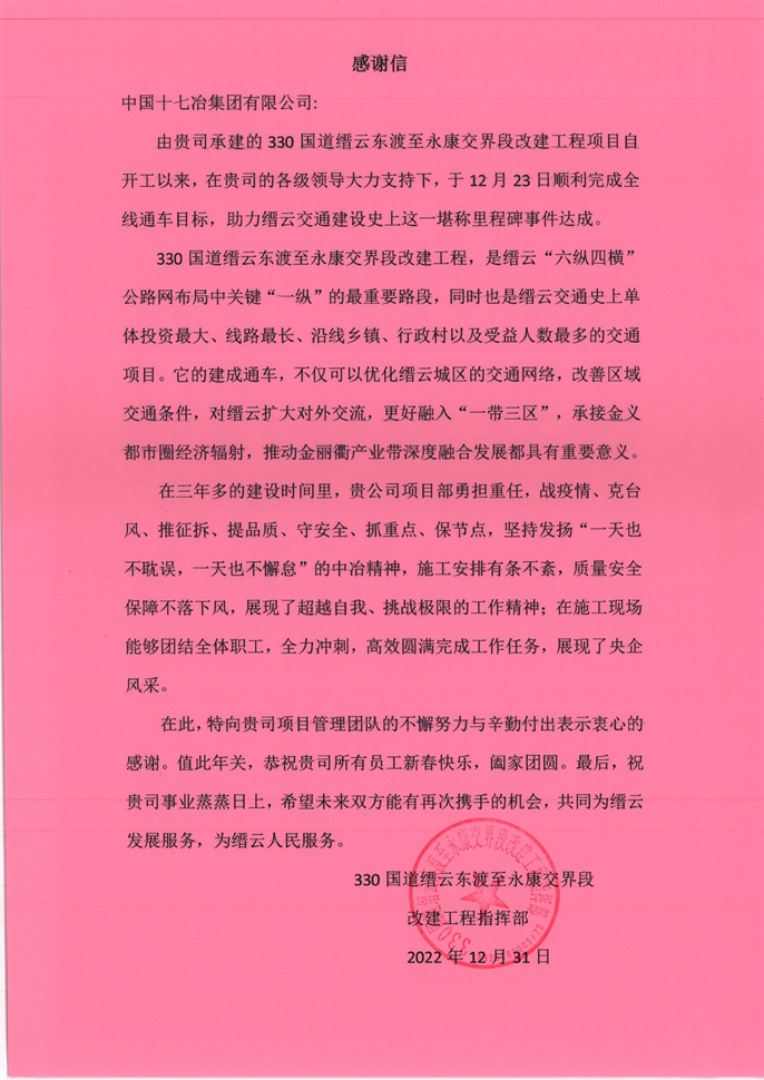 12月31日,浙江330国道缙云东渡至永康交界段改建工程指挥部向中国十七冶致感谢信,对路桥分公司承建顺利完成通车目标提出表扬并致以感谢。