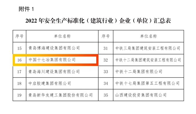 1月3日,中国十七冶集团收到中国安全产业协会建筑行业分会表彰文件和奖牌,公司获评“2022年安全生产标准化(建筑行业)企业(单位)”称号,山东分公司潍坊林语观澜项目、青岛分公司青岛国际院士港项目获评“2022年安全生产标准化(建筑行业)项目”称号,王永吉获“2022年安全生产标准化(建筑行业)带头人”称号。