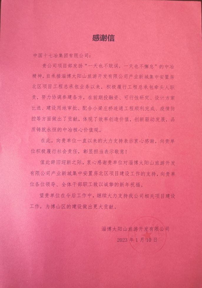 1月10日,中国十七冶集团收到淄博太阳山旅游开发有限公司发来的感谢信,对山东分公司优质的项目管理服务致以衷心感谢。