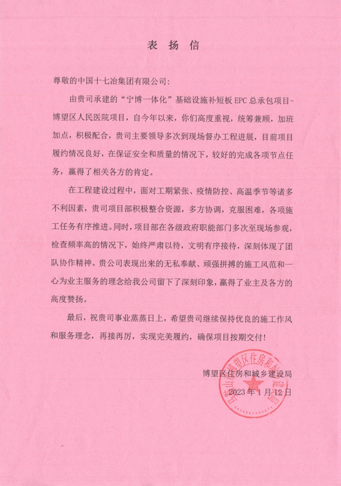 1月12日,马鞍山市博望区住房和城乡建设局致信中国十七冶集团,对管廊分公司马鞍山市博望区人民医院项目部在保证安全和质量的情况下较好完成各项节点任务提出表扬。