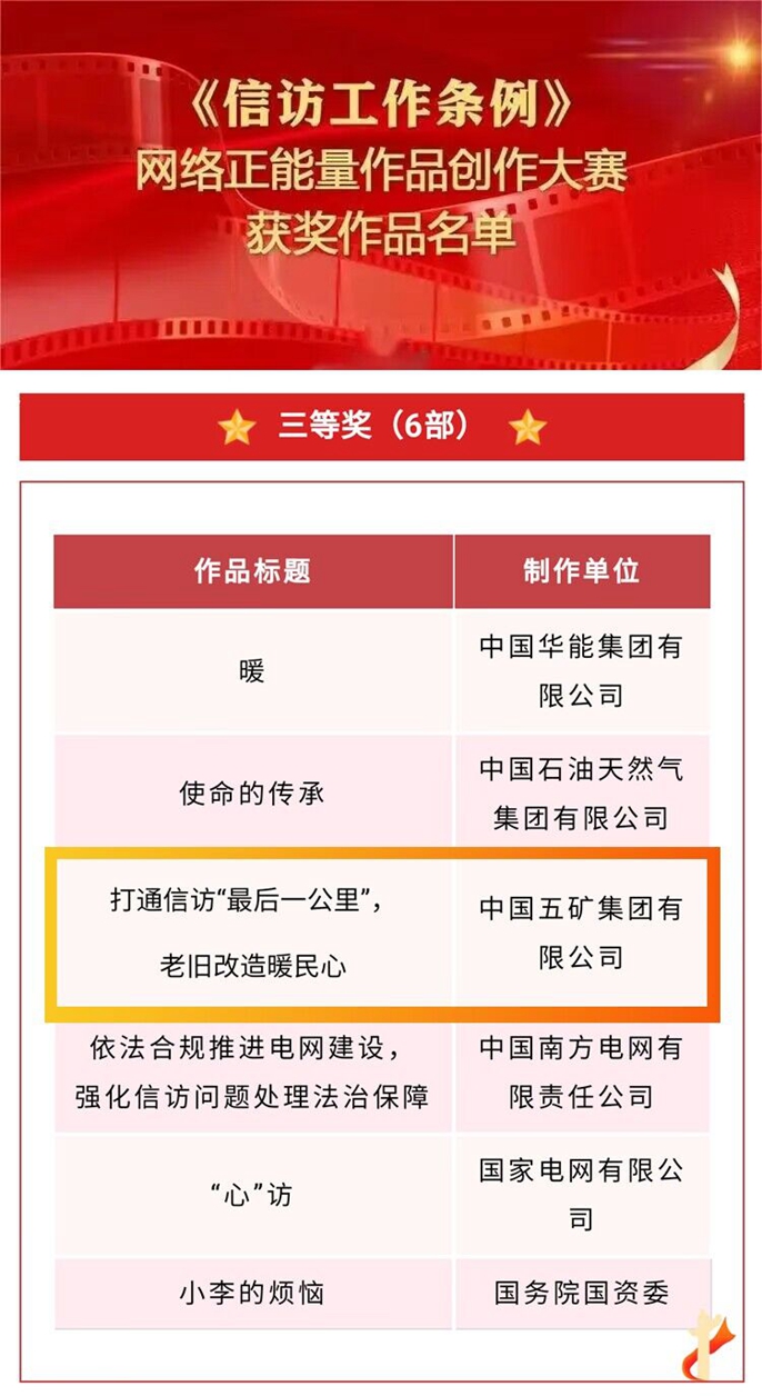 3月6日,国务院国资委发布国资系统在国家信访局组织开展的《信访工作条例》网络正能量作品创作大赛中的获奖名单,中国十七冶创作的微视频作品《打通信访工作最后一公里,老旧改造暖民心》荣获三等奖,为国资系统获奖的12部作品之一。
