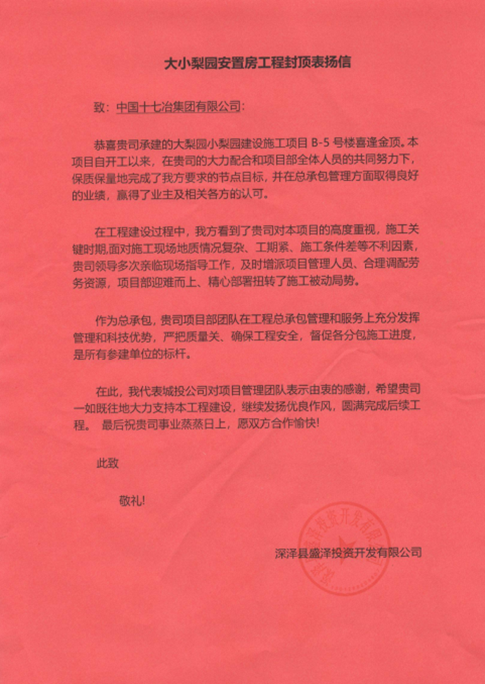 近日,河北深泽县盛泽投资开发有限公司向中国十七冶集团致表扬信,对建安分公司深泽大、小梨园安置房项目部在施工过程中攻坚克难,优质高效完成工程B-5号楼封顶目标致以衷心的感谢。