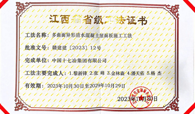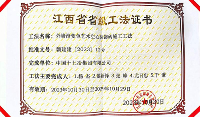 近日,从江西省住建厅获悉,中国十七冶工建分公司景德镇艺术职业大学项目部申报的《多曲面异形清水混凝土屋面板施工工法》《外墙渐变色艺术空心装饰砖施工工法》2项成果被评定为江西省工程建设2023年度第一批省级工法。