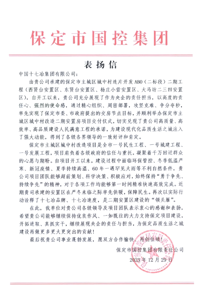 继2023年12月26日保定市国控集团向中国十七冶集团致表扬信后,12月29日,保定市国控集团再次致信,对房屋分公司保定主城区城中村连片开发 ABO(二标段)二期项目团队在2023年率先实现了保定市委、市政府提出的交房节点目标提出表扬。