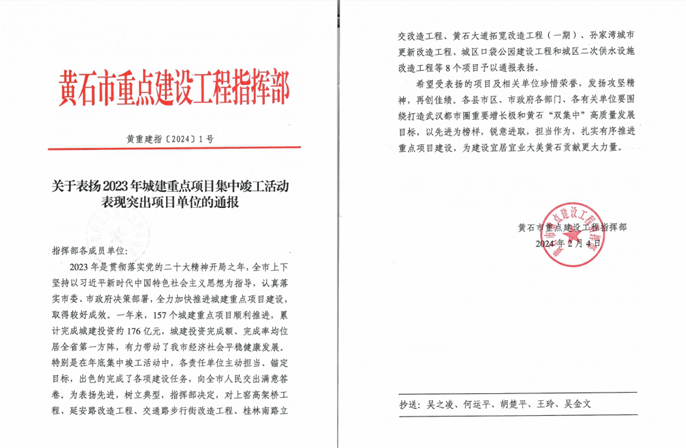 2月4日,黄石市重点建设工程指挥部发布《关于表扬2023年城建重点项目集中竣工活动表现突出项目党委的通报》,为表扬先进,树立典型,对黄石大道拓宽改造工程(一期)等8个项目予以通报表扬。