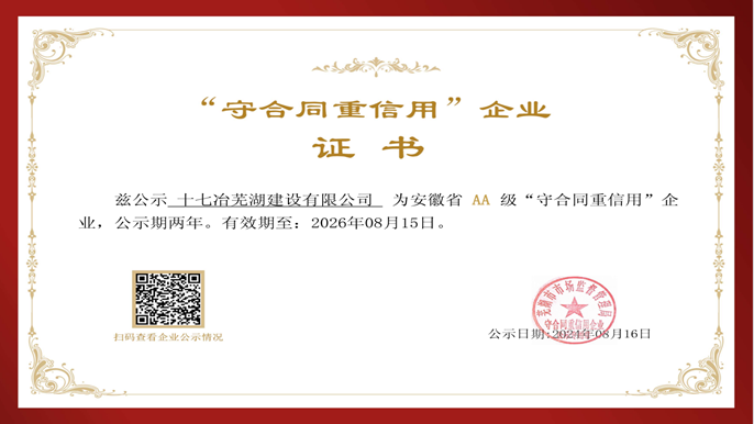 8月16日,从安徽省市场监督管理局获悉,十七冶芜湖建设有限公司获评安徽省AA级“守合同重信用”企业,公示期两年。