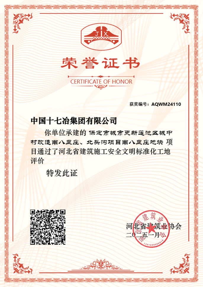 近日,从河北省建筑业协会获悉,中国十七冶承建的保定城改七标项目南八里庄地块工程,荣获2024年度河北省建筑施工安全文明标准化工地。